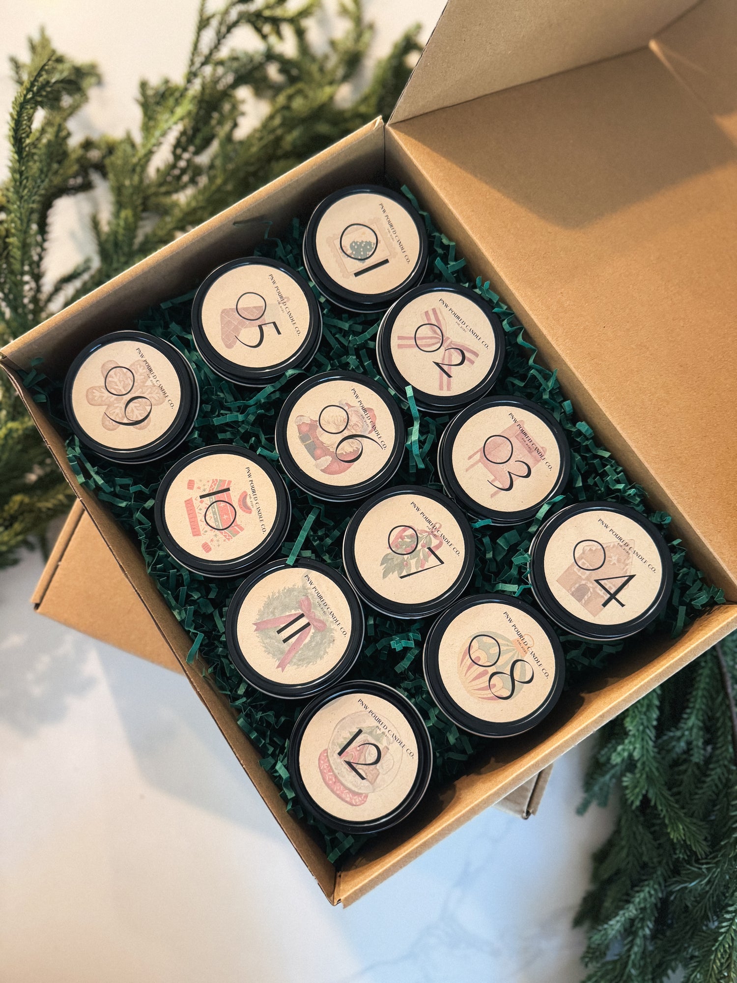 Unwrap the magic of the season with our 12 Days of Christmas Candle Box. Each box includes twelve 4oz candles, hand-poured in small batches and numbered for each of the twelve days leading up to Christmas. Thoughtfully packaged and filled with cozy, festive scents. They're perfect for gifting or savoring yourself this holiday season!