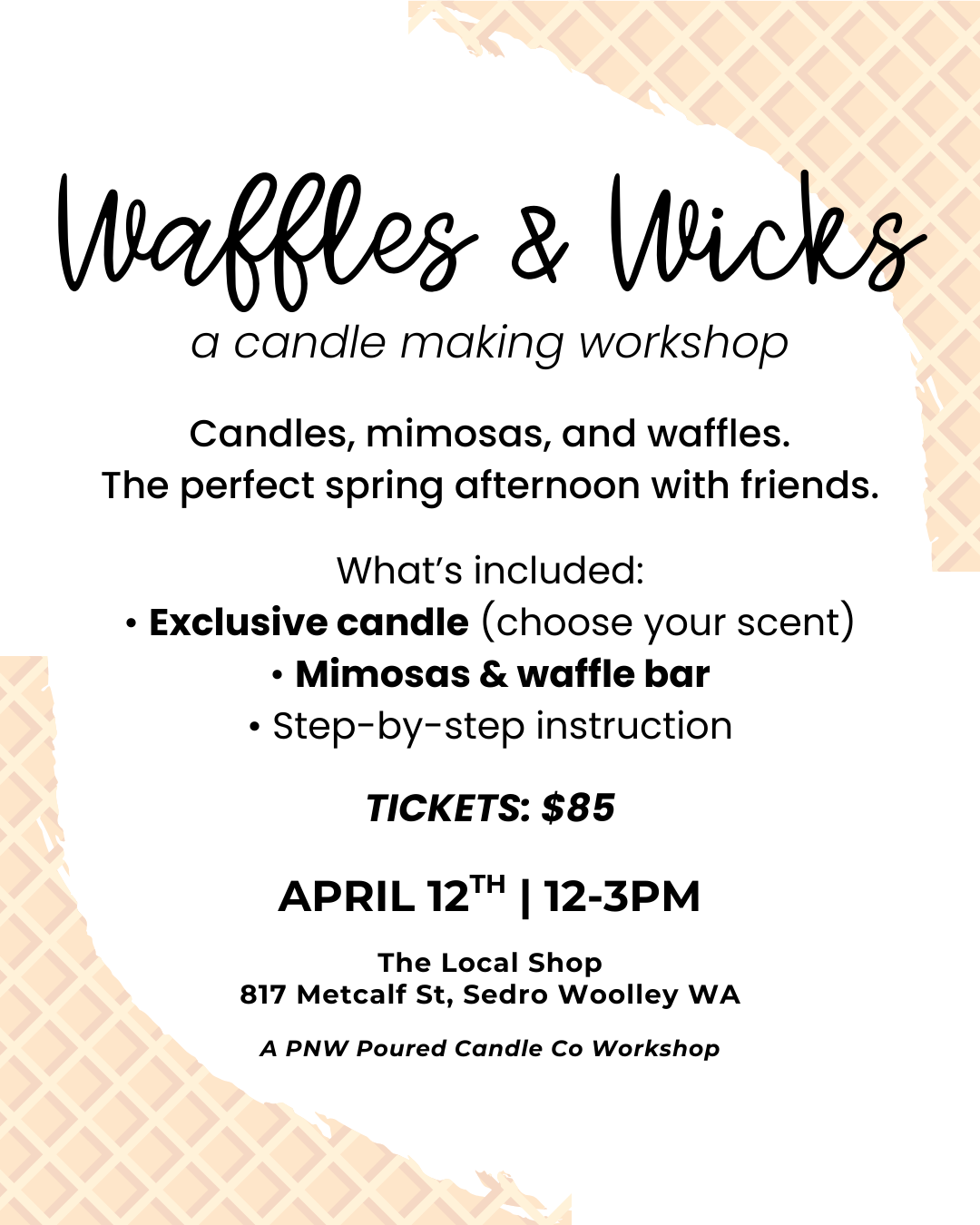 Waffles & Wicks is our spring candle workshop. Pour your own exclusive candle, enjoy a mimosa and a create-your-own waffle bar.
